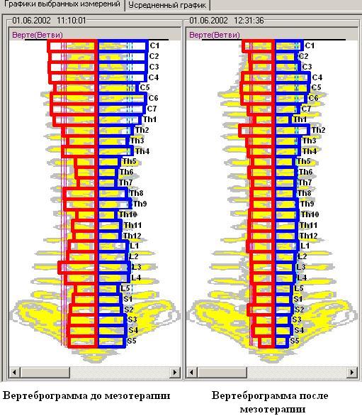 Субъективно пациентка указывает на ощущение легкости в спине. Значит ли это, что пациентка навсегда избавилась от проблем? Конечно, нет! Но благодаря мониторированию мы отчетливо видим ресурс данной пациентки, можем осуществлять контроль за дальнейшим лечением, вносить коррекции в соответствии с её индивидуальностью, подбирать препараты обоснованно, а не теоретически, назначать следующую процедуру с учетом индивидуальных сроков выведения препаратов - когда диаграмма снова "ломается" в сторону дестабилизации, то проводим следующий сеанс мезотерапиии, можем определять длительность курса мезотерапии и кратность процедур. |